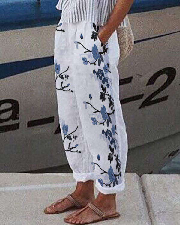 Casual Loosen Linen & cotton Pockets Floral Pants