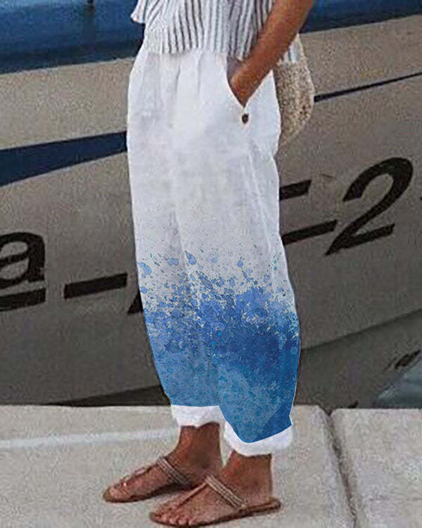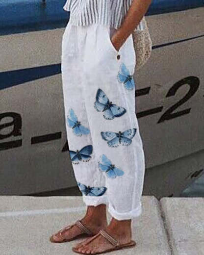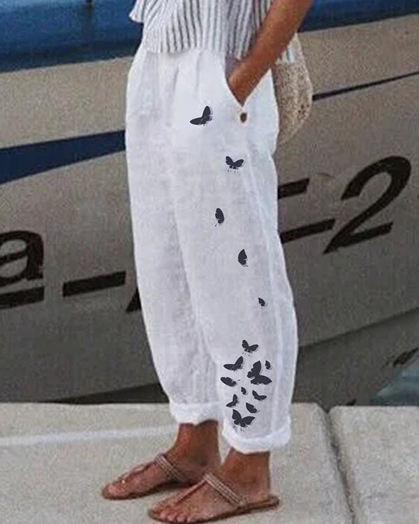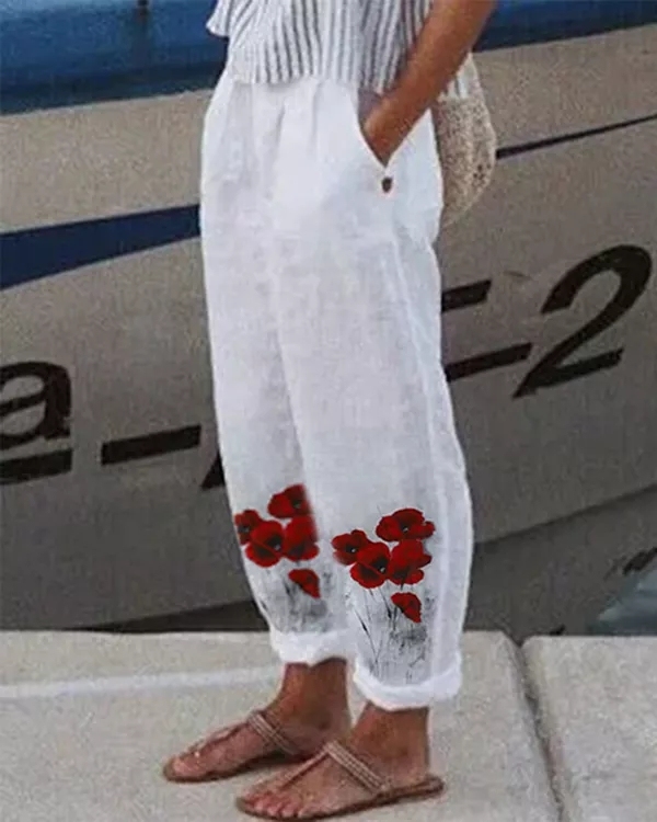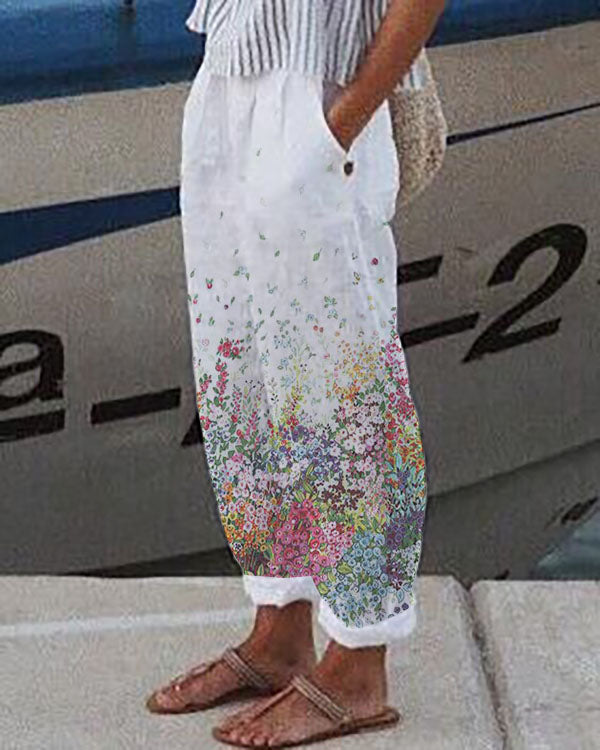 Casual Loosen Linen & cotton Pockets Floral Pants